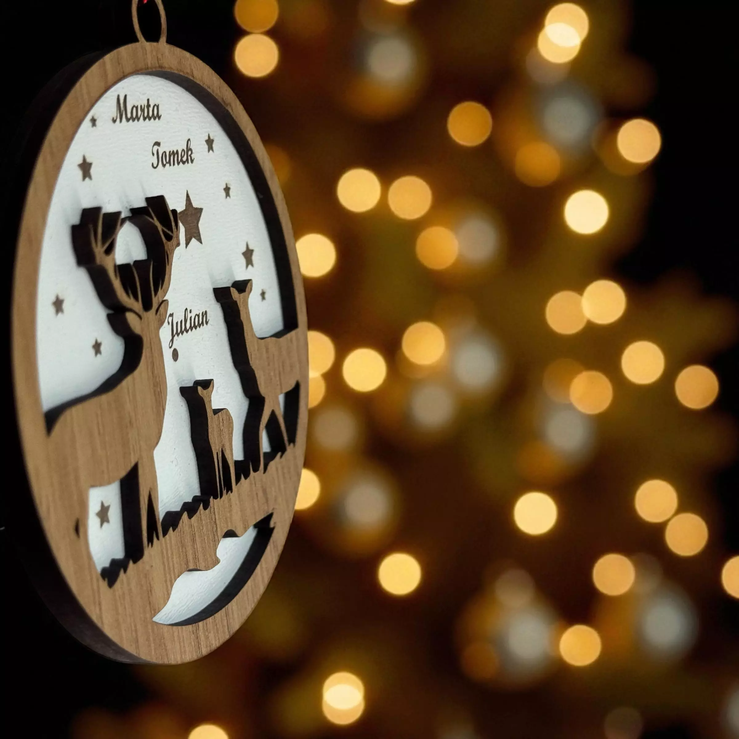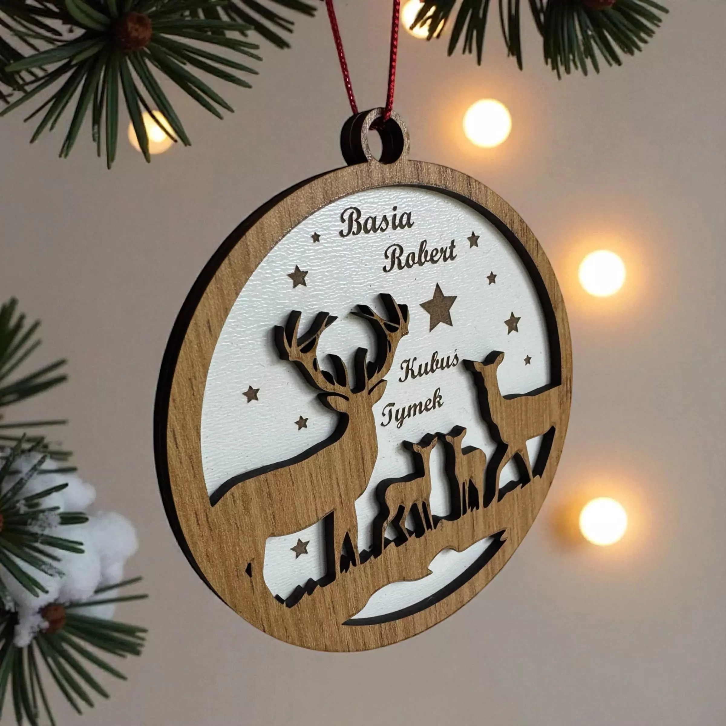 Personalizowana bombka z motywem rodziny sarenek to połączenie prostoty, natury i świątecznego klimatu.